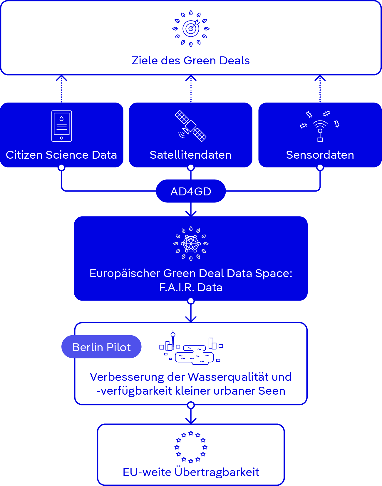 Schematische Darstellung der Entwicklung eines Green Deal Data Space im Projekt AD4GD entlang der Berliner Pilotstudie zu kleinen Seen