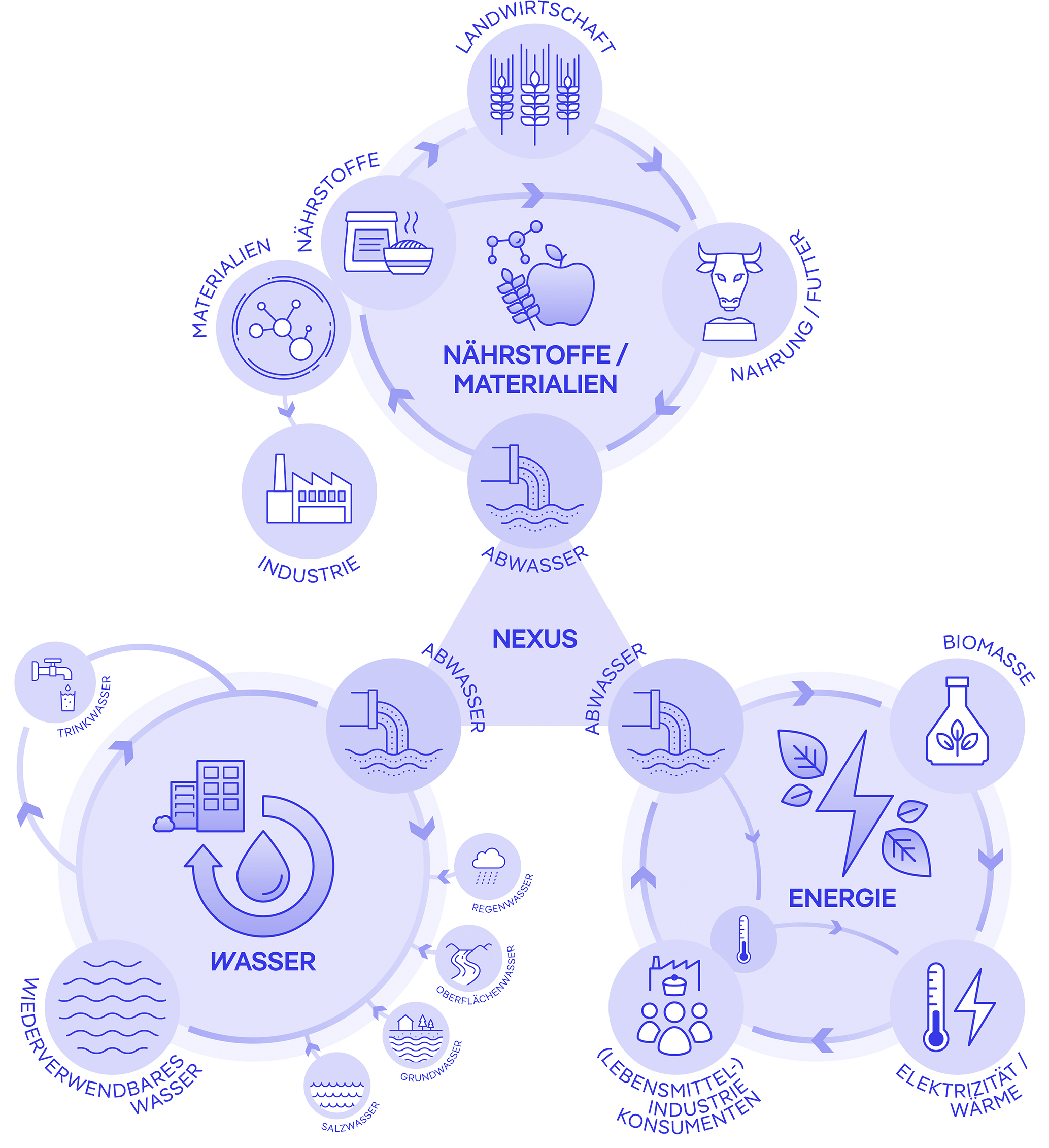 Synergien in der Kreislaufwirtschaft: Abwasser ist nicht nur eine Ressource zur Rückgewinnung von wiederverwendbarem Wasser, sondern enthält z.B. auch Nährstoffe und Energie, die zurückgewonnen werden können.