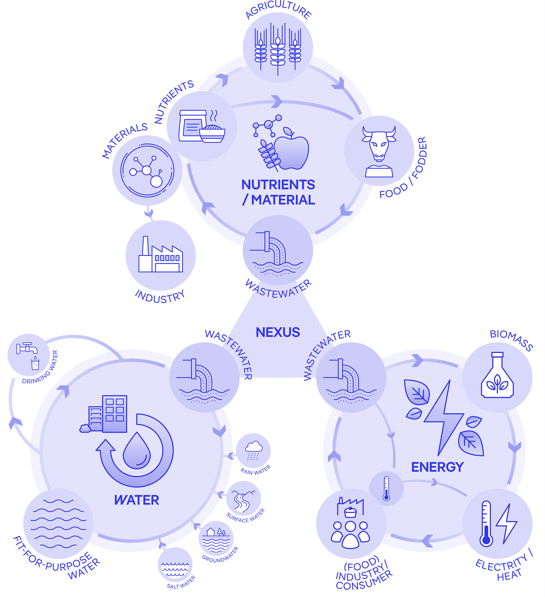 Synergies in circular economy: wastewater is a resource for producing fit-for-purpose water and also contains materials (e.g. nutrients) and energy which can be recovered.