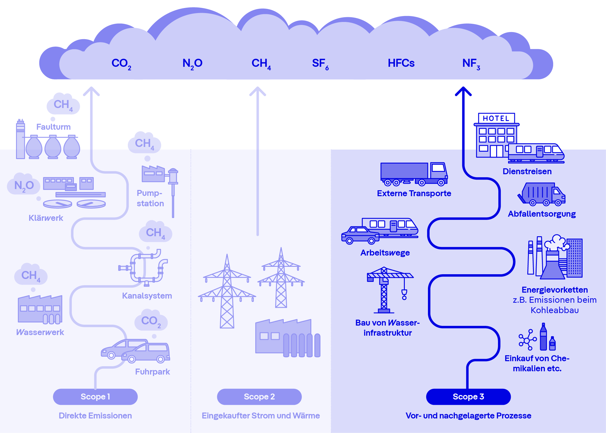 Bilanzrahmen der Treibhausgasemissionen im Wassersektor für die drei Bereiche (engl. Scopes) des Greenhouse Gas Protocol. Das Hauptaugenmerk des Projekts liegt auf den Scope-3-Emissionen.