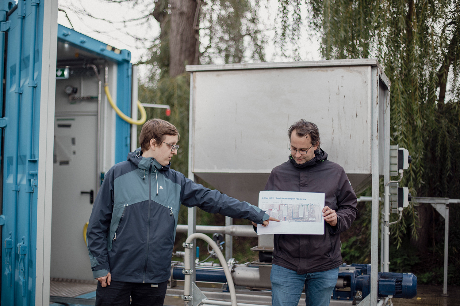Vor dem blauen Container auf der Versuchsstation des IASP Berlin | Institut für Agrar- und Stadtökologische Projekte im malerischen Berge bei Nauen freut sich Johannes auf alle Interessierten. Kommen Sie vorbei, erfahren Sie mehr über die Schließung von Nährstoffkreisläufen in der europäischen Landwirtschaft und schauen Sie sich unsere spannende Pilotanlage aus nächster Nähe an!