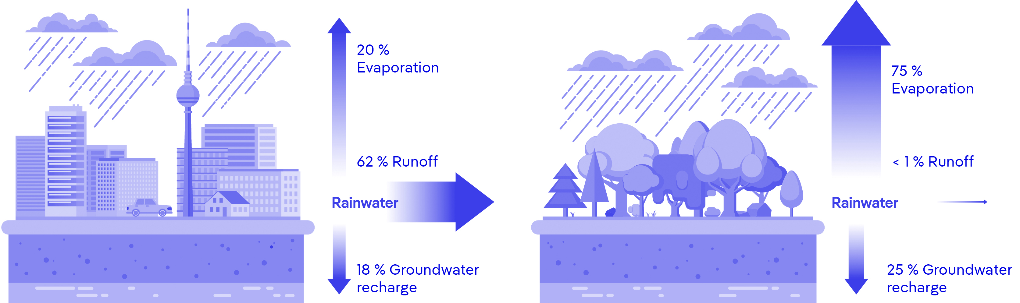 The negative effects of climate change related weather extremes are especially severe in cities and urban areas. High grades of surface sealing and building densities aggravate flooding risks due to heavy rainfall and the urban heat island effects.