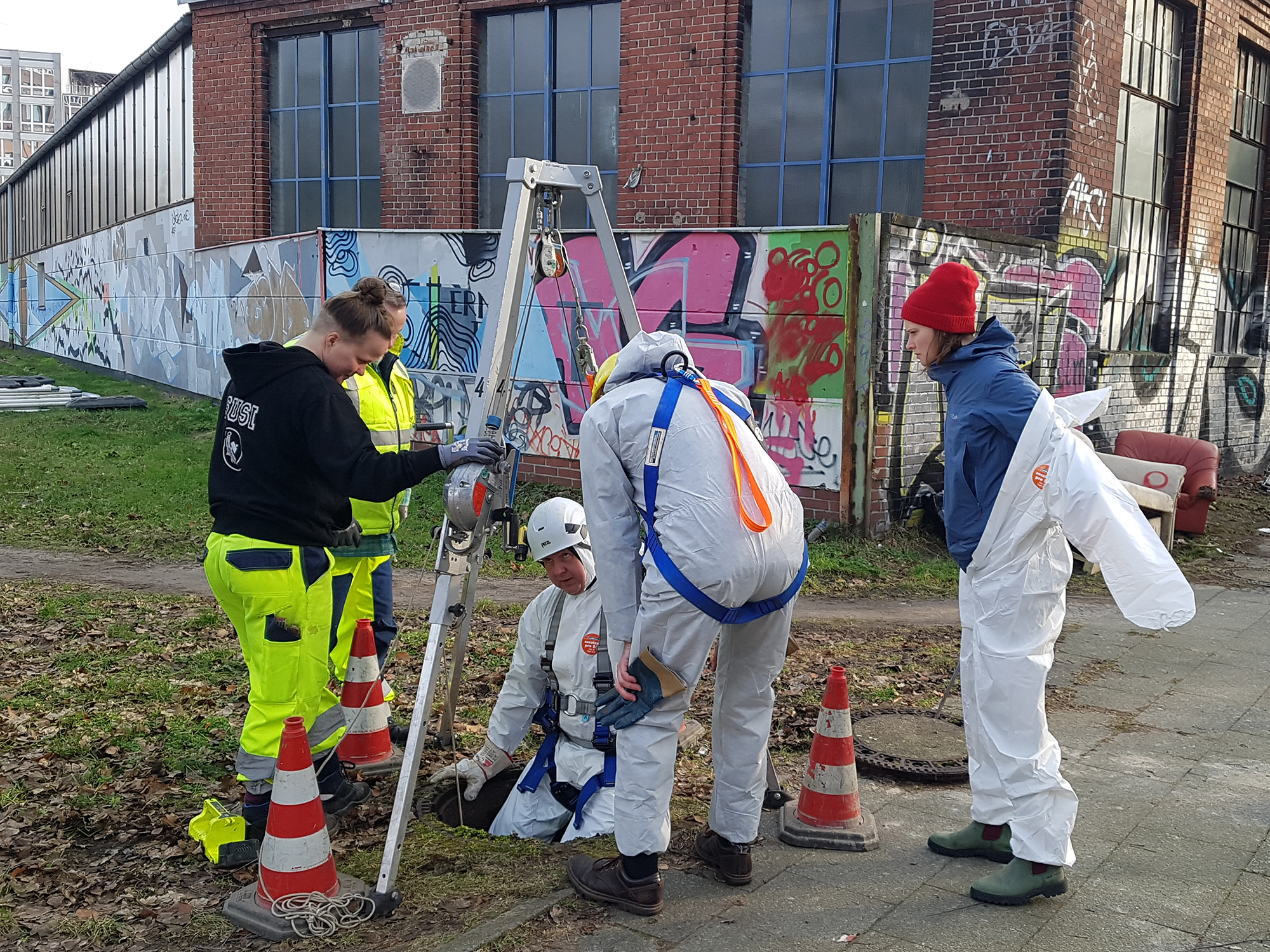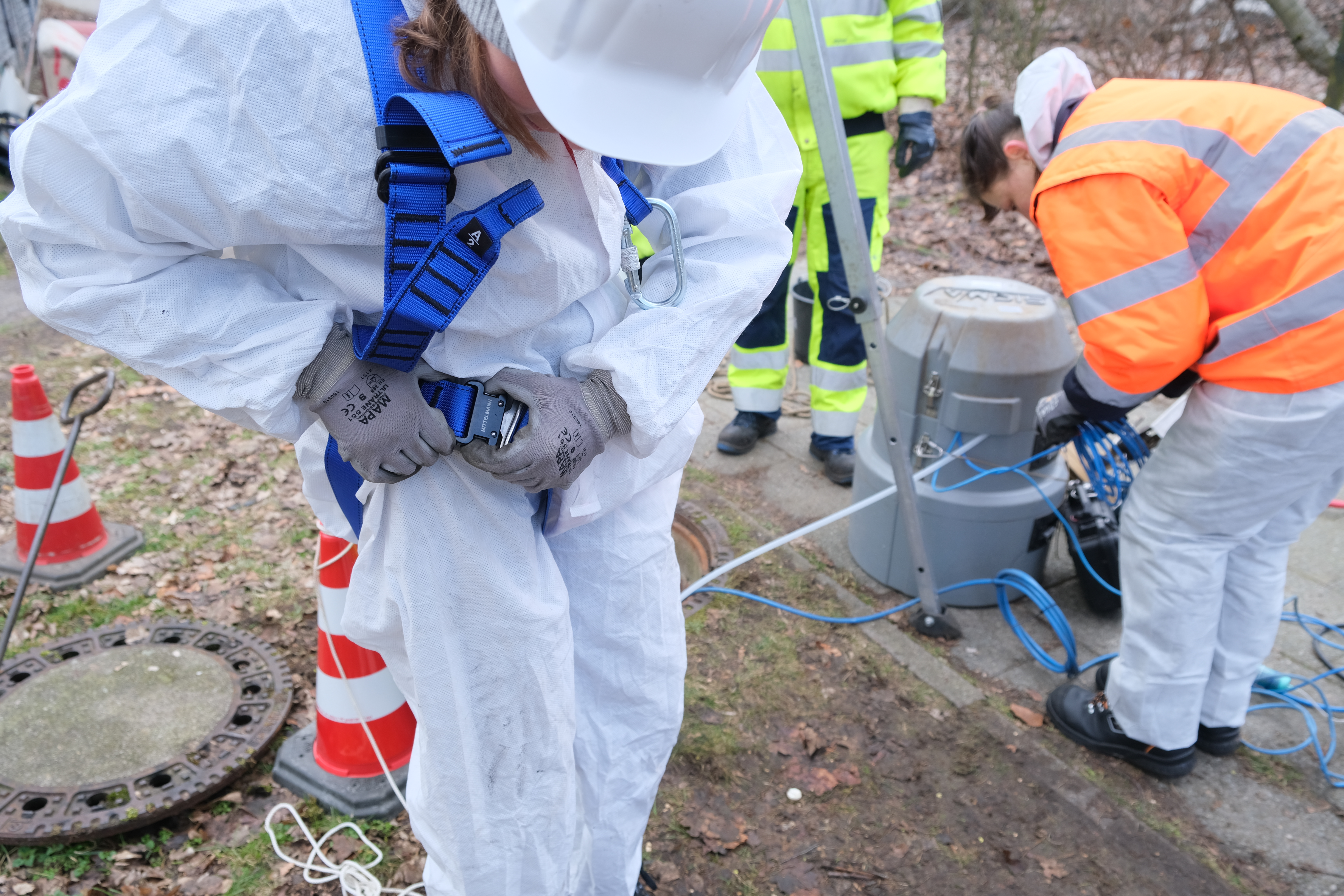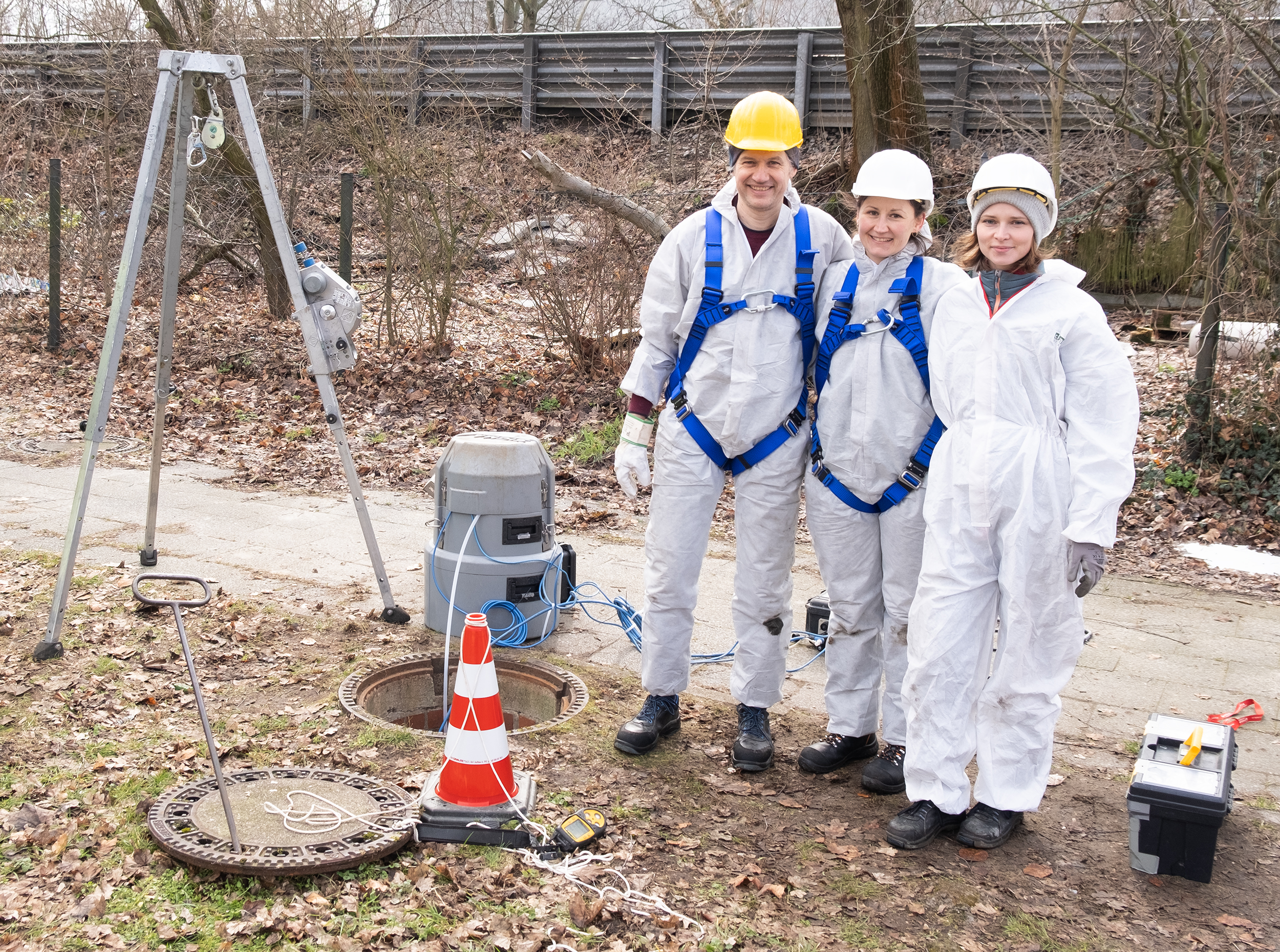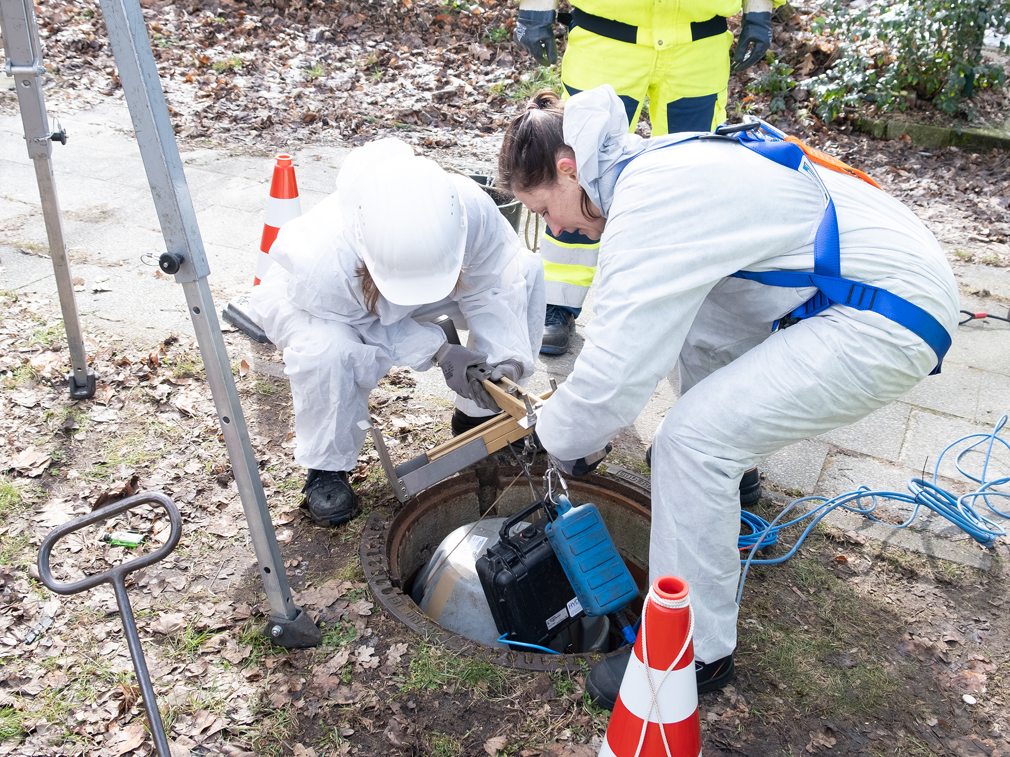 To monitor PFAS and iPMT concentrations in urban stormwater runoff, automated samplers were installed in 2 storm sewers. Sensors at the bottom of the sewer measure water level and flow, and initiate sampling during rainy weather. Data loggers provide web access to the measurement data, which in turn gives us the signal to take the rainwater samples to the laboratory for analysis.