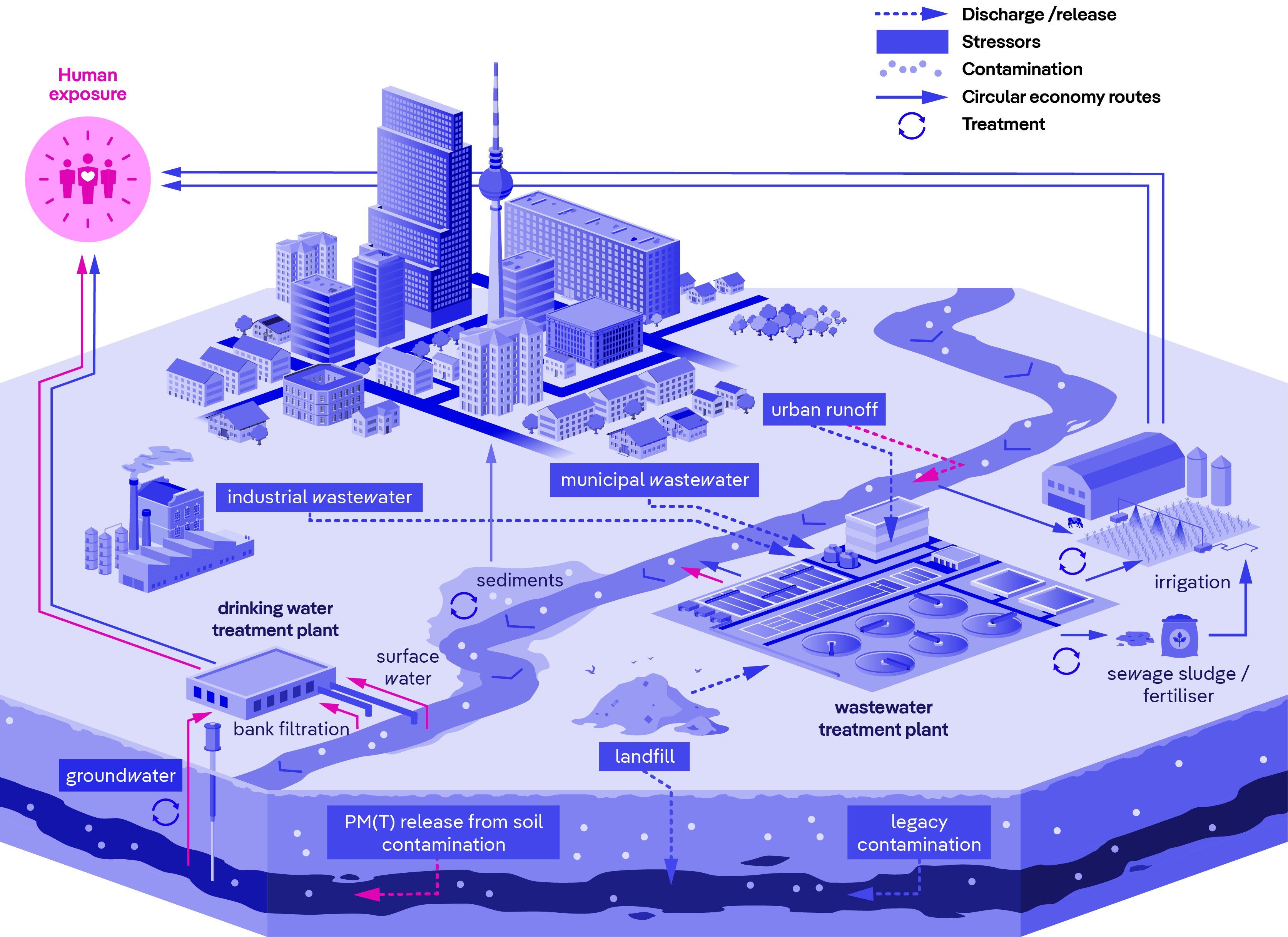 Circular economy routes and chemical emission pathways which are relevant and investigated in PROMISCES (Berlin's semi-closed water cycle in pink)